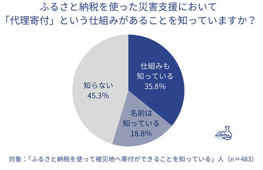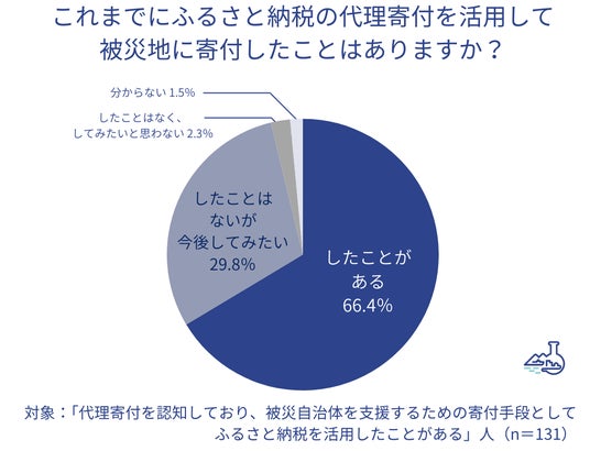 - ふるさと納税で被災自治体に寄付できることを知っている人のうち、代理寄付という仕組みがあることを「知っている」人が35.8%、「仕組みは知らないが名前は知っている」という人が18.8%。仕組みを知っていると回答した人のうち、「代理寄付を活用して被災地に寄付したことがある」という回答が66.4%、「したことはないが今後してみたい」が29.8%となった。