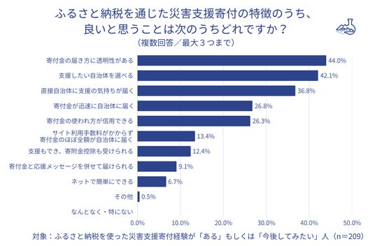 - ふるさと納税による災害支援寄付の「良い」と思う特徴は「寄付金の届き方に透明性がある」44.0%が最も支持された。ほぼ並んで「支援したい自治体を選べる」42.1%も評価されたほか、「直接自治体に支援の気持ちが届く」「寄付金が迅速に自治体に届く」「寄付金の使われ方が信用できる」も回答を集めた。