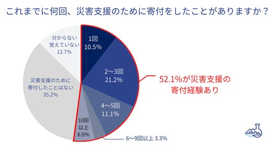 - 災害支援のために金銭の寄付をしたことがある人の割合は52.1%。寄付経験の回数は最も多いのが「2~3回」で、東日本大震災が起きた2011年、熊本地震が起きた2016年、能登半島地震が起きた2024年に寄付した経験がある人が多かった。2024年に起きた災害の中で最も寄付したとの回答が多かったのは、1月の能登半島地震、次いで9月の能登半島豪雨となっている。