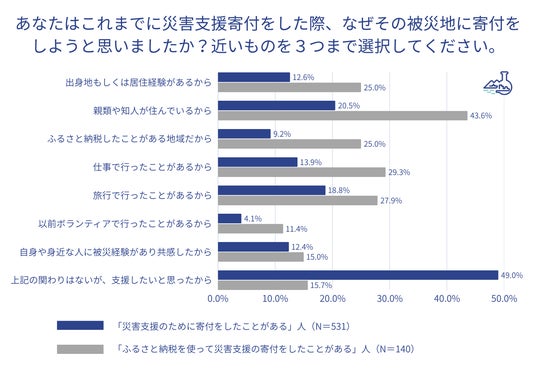 - 被災地に寄付しようと思った理由は、最多が「(特段その地域との)関わりはないが、支援したいと思ったから」が49.0%。また、ふるさと納税での災害支援寄付経験者は、寄付をした地域との関わりを理由に挙げた人が多く「親類や知人が住んでいるから」が43.6%、「仕事で行ったことがあるから」が29.3%、「旅行で行ったことがあるから」が27.9%という結果となった。