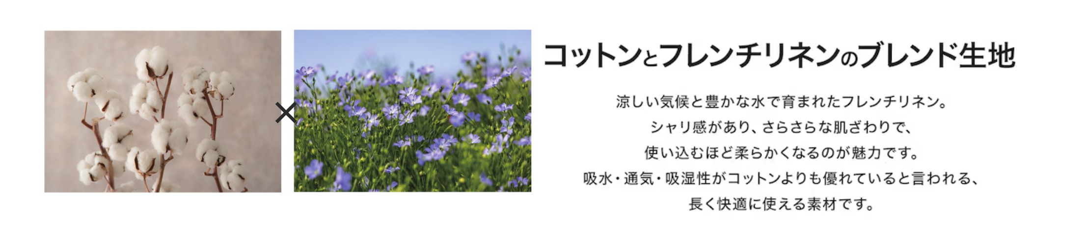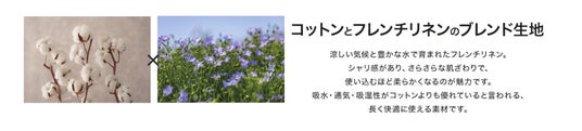 リネン特有のシャリ感を活かしたさらっとした肌触りに、コットンのやわらかさをプラス。使い込むほど風合いが増し、柔らかくなる“育てる素材”です。