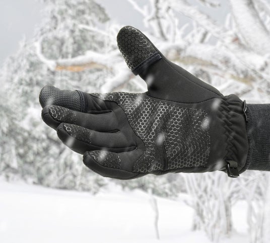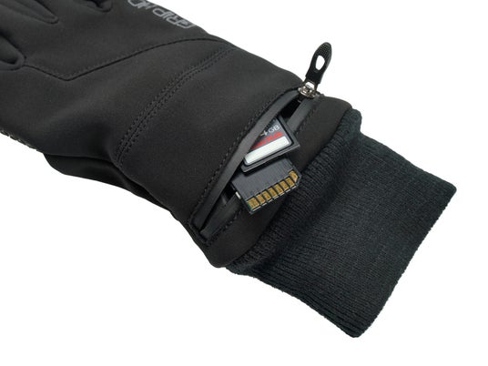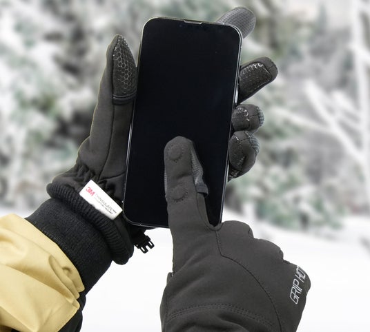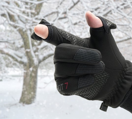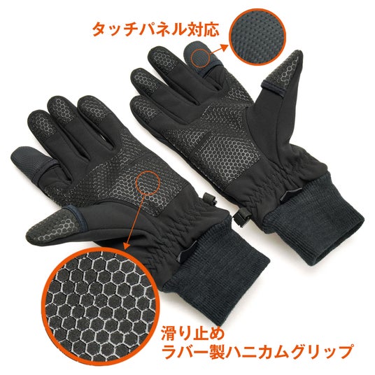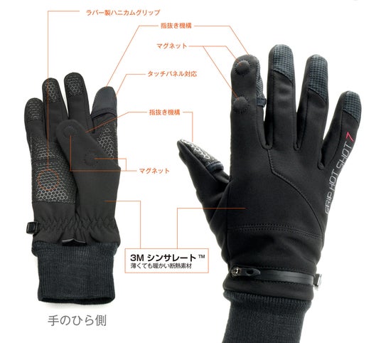 5本の指のうち、親指と人差し指は指ぬき機構を採用。カメラのピント操作やシャッターボタン操作など緻密な操作が必要な時に重宝します。また、人差し指はタッチパネル対応生地を採用していますので、グローブを着けたままでもスマートフォンやカメラのタッチパネル操作が可能です。
