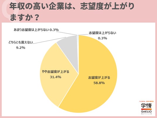 年収の高い企業と志望度の関係を尋ねた質問に対しては、「志望度が上がる」との回答が58.8%。「やや上がる」31.4%を合わせると、計90.2%を占めました。「給料が高ければ仕事のモチベになる」「ただ年収が高いだけでは決められないが、現在よりも年収が高ければ候補の一つには入れると思う」「激務でも報酬があるなら頑張ろうと思える」などの声が上がっています。