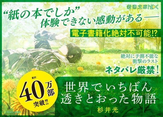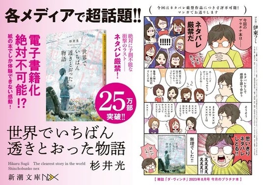「ネタバレ厳禁」「電子書籍化映像化絶対不可能!?」で超話題! いま最注目の作品『世界でいちばん透きとおった物語』(杉井光/著、新潮文庫nex)が限定カバーで登場。イラストは超人気イラストレーター「ふすい」さんの完全描き下ろしです。季節限定の特装版ですので、この機をお見逃しなく!