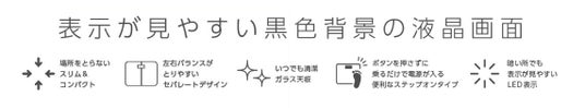 毎日の使いやすさにこだわった、コンパクトな体重計です。ボタンを押さずに乗るだけで電源が入る便利なステップオンタイプで、左右のバランスがとりやすいセパレートデザインです。また、暗い場所でも表示が見やすい黒色背景の液晶デザインを採用し、快適に日々の測定を行うことができます。