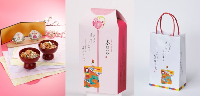 菱餅をイメージしたえびせんべいとお雛様、お内裏様、桃型の炙り焼きが入った可愛らしいお品です。