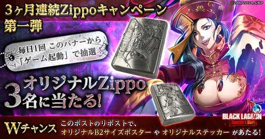 2月に開催したZippo抽選キャンペーンでも大変好評だった「レヴィ」の描かれたオリジナルZippoが復刻。応募方法は、該当ポストからゲームを起動するだけ。