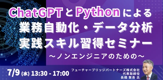 JPI(日本計画研究所)は、フューチャーブリッジパートナーズ株式会社 代表取締役 長橋 賢吾 氏を招聘し、ChatGPTとPythonによる業務自動化・データ分析実践スキルについて詳説いただくセミナーを開催します。