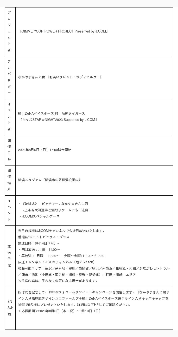 横浜DeNAベイスターズのオフィシャルスポンサーである株式会社ジェイコム湘南・神奈川(所在地:神奈川 県横浜市、代表取締役社長:原 清)は、YOKOHAMAを愛するファンの思いをひとつに横浜DeNAベイスターズを応援するプロジェクト「GIMME YOUR POWER PROJECT Presented by J:COM」のアンバサダー(応援大使)として、みんなにパワーを与えてくれる“なかやまきんに君”を迎え、8月6日(日)に横浜スタジアムにて始球式を実施しました。