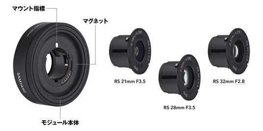 ソニーEマウント(フルサイズ)に対応する、AFレンズで、世界初(※)のコンセプトで、21mm F3.5、28mm F3.5、32mm F2.8の3つの光学系が交換可能です。ハードケースに3つの光学系付きでセット販売します。