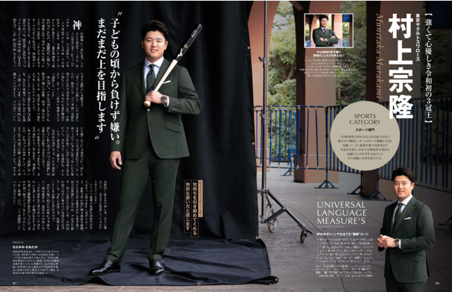 村上宗隆選手は、東京ヤクルトスワローズの球団カラーであり、自身のラッキーカラーがグリーンであることから、トレンドのモスグリーンのオーダースーツで登場。「お似合いですよ」と編集部からの声に、はにかんだような笑顔を浮かべた。来年3月に始まるWBCでは日本の主砲を務める。意気込みは?という質問に「日の丸を背負う責任を持って挑みたいと思います。五輪のときとはまた違った緊張感があるでしょうが、自分が引っ張っていけるよう今からしっかり準備したい。どうぞ期待していてください!」と語ってくださいました。