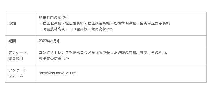 使い捨てコンタクトレンズは家庭の排水口などから誤って流れ出し、海洋流出した際にはマイクロプラスチックとして海洋汚染の一因になる恐れがあります。一般社団法人日本コンタクトレンズ協会(東京・文京区)の調査ではコンタクトレンズをトイレや洗面所の流しなどゴミ箱以外に捨てている人は約3割に上っています。実態をさらに明らかにし、今後の啓発に繋げていくために、アンケートなどによる実態調査を実施します。対象は島根県内の高校生で、コンタクトレンズデビューしたばかりの若い世代の実態を明らかにします。