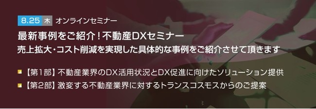 トランスコスモス株式会社(代表取締役共同社長:石見浩一、牟田正明)は、オンラインセミナー最新事例をご紹介!不動産DXセミナーを8月25日(木)に開催します。