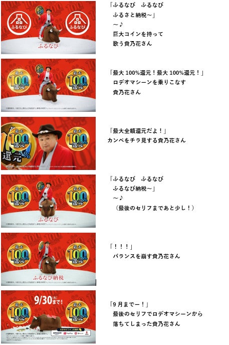株式会社アイモバイル(本社:東京都渋谷区、代表取締役社長:野口哲也、東証プライム市場) が運営するふるさと納税サイト「ふるなび」( https://furunavi.jp/ )は、貴乃花 光司 (第65代横綱)を起用した、ふるさと納税サイト「ふるなび」の新TV-CM『最大100%還元キャンペーン告知 ロデオ篇』/『最大100%還元!ふるなびトラベル ロデオ篇』/『最大100%還元!ふるなびカタログ ロデオ篇』 を、2025年7月26日 (土) より全国にて放映いたします。