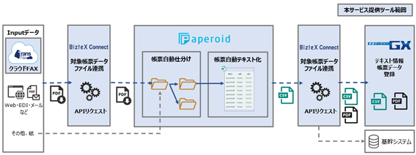 帳票のインプットデータはBizteX株式会社の「BizteX Connect」で連携を行い、FAXの場合は株式会社トランザクトの「TransFax」の利用が可能です。TISの「Paperoid」で、帳票の自動振分からテキスト化を行い、株式会社インテックの快速サーチャーGXで電子帳簿保存法に則したデータ保存までをワンストップで行うことができます。
