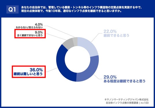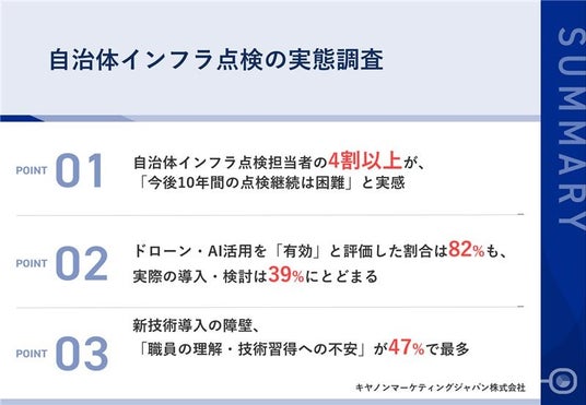 キヤノンマーケティングジャパン株式会社(代表取締役社長:足立正親、以下キヤノンMJ)は、インフラ点検業務に携わる自治体職員を対象とした調査結果を発表します。労働人口減少が進む「8掛け社会※1」を背景に、インフラ老朽化が進む一方、技術者不足で点検継続が困難となっています。国土交通省「インフラ長寿命化計画※2」により、デジタル技術を活用した点検の効率化と予防保全への転換が求められていますが、本調査では点検継続が困難との回答が4割を超える一方、新技術導入の課題が明らかになりました。キヤノンMJでは、調査結果に加え、東京都大田区のデジタル技術の活用事例を紹介するセミナーを2026年4月22日に開催し、解決策の普及に取り組んでまいります。
