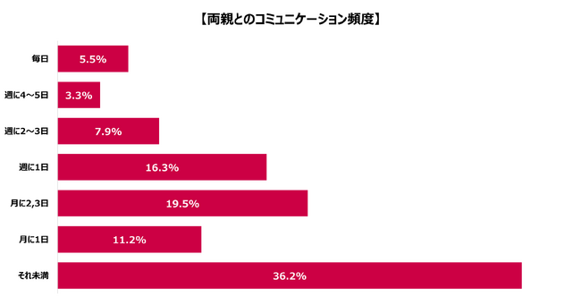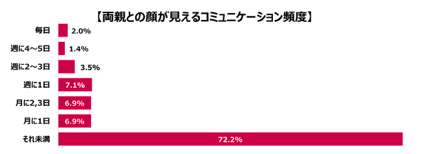 Topic 1:直接会う以外の両親とのコミュニケーション頻度について、月に1回以下しかコミュニケーションをとっていない割合は約5割、また、顔が見えるコミュニケーションをとっていない割合は約8割も。