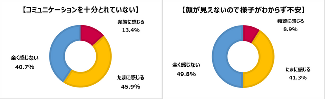 離れて暮らす両親とコミュニケーションを十分にとれていないと「頻繁に感じる」が13.4%、「たまに感じる」は45.9%が回答し、全体の約6割が両親とのコミュニケーションが十分ではないと感じていることが分かりました。また、約5割が「顔が見えないため様子がわからず不安」と感じていることが分かりました。