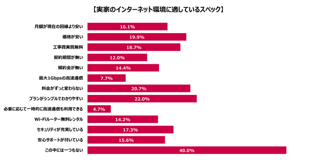 すでに実家で契約しているインターネット環境に対する意見としては「月額を抑えたい」と回答した方が20.5%と最も高いことが分かりました。また、実家のインターネット回線に適していると感じるスペックについて「月額が現在の回線より安い」と「価格が安い」の合計で36%を占め、続いて「プランがシンプルで分かりやすい」が22%いることが分かりました。