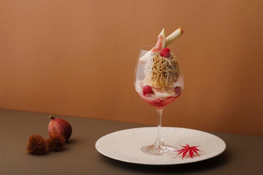 程良い甘みとさっぱりとした風味が特徴の和歌山県産イチジクと、上品な甘さと香ばしさを合わせ持つ和栗をモンブランに仕立てた、この時期ならではの秋パフェをご用意いたしました。和歌山県産のイチジクはフレッシュやムースなどさまざまなアレンジで味わっていただき、さらに、サクサクのメレンゲや白ワインゼリー、バニラアイスクリームと、グラスの中にさまざまな食感を詰め込みました。仕上げは、クリーミーでなめらかな口当たりの和栗モンブランをお客様の目の前でたっぷりと絞り、見た目にもお楽しみいただける演出でご提供いたします。