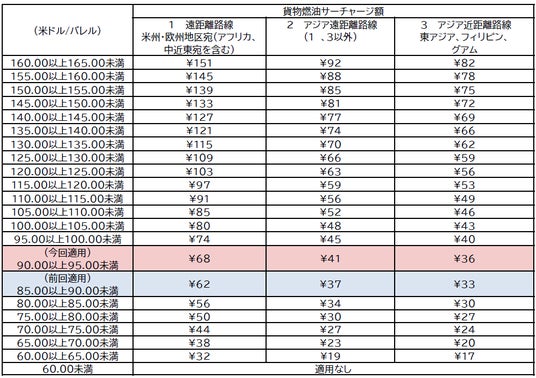 基準となる2025年11月のジェット燃料の平均価格が1バレルあたり93.11米ドルであったことから、燃油指標価格を「90.00以上95.00未満」とし、サーチャージ額は1kgあたり68円(米州・欧州など遠距離路線)、41円(アジア遠距離路線)、36円(アジア近距離路線)となります。
