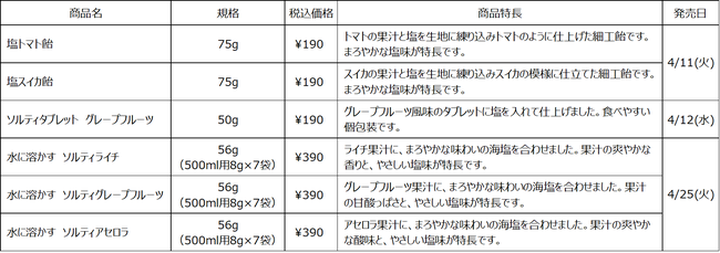 このたび、暑い季節を楽しくおいしく過ごす商品として塩分を手軽に摂取できる6アイテムを新たに発売します。
