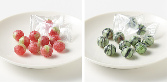トマトの果汁と塩を生地に練り込みトマトのように仕上げた塩トマト飴は、トマトの青みとまろやかな塩味が特長です。スイカの果汁と塩を生地に練り込み、スイカの模様に仕立てた塩スイカ飴は、スイカのさわやかな果汁感とまろやかな塩味が特長です。いずれも職人さんが手作業で1本1本模様を作り、棒状に伸ばした飴をカットしてつくる細工飴です。