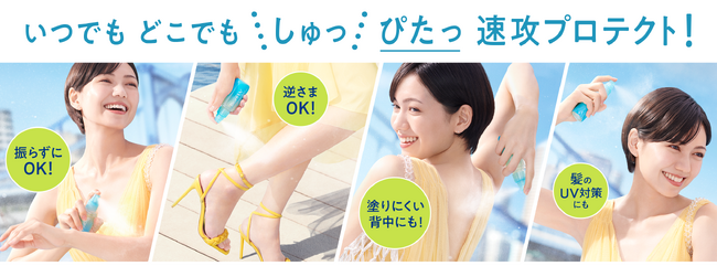 お客さまからは、「噴射音も気にならず、白くならないので、お出かけ先での塗り直しにピッタリ」、「水みたいにさらさらしていてべたつかないから外出先でも使いやすい」、「髪のUV対策をしたかった」、「逆さにしても使えるから、足にも使いやすい」など、使いやすさについて多くの声が寄せられています。