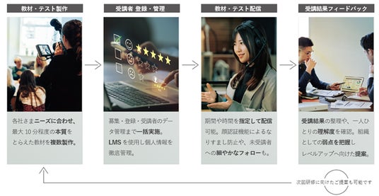 手間と費用のかかるコンテンツ動画の製作・配信から、煩雑な業務である受講者管理、テスト結果の集計、研修のフィードバックまでの一式を提供することが強みです。