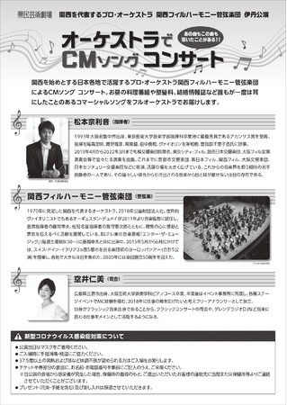関西を始めとする日本各地で活躍するプロ・オーケストラ関西フィルハーモニー管弦楽団によるCMソングを集めたコンサート。お昼の料理番組や整髪料、結婚情報誌など誰もが一度は耳にしたことのあるコマーシャルソングをフルオーケストラで演奏する。