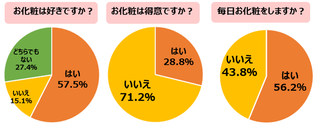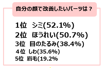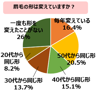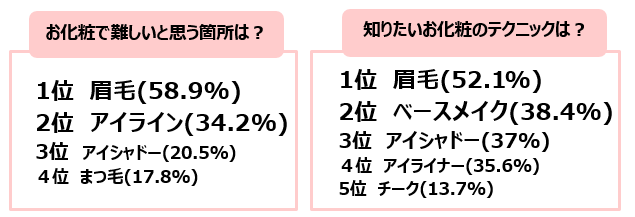 今回の調査によると、「お化粧は得意ですか?」という質問に対し、71.2%が「いいえ」と回答。60代女性の大半がお化粧は不得意だと感じていることがわかりました。「お化粧で困っていることはありますか?」という質問では、63%が「はい」と回答。お悩みの内容は、「眉毛が左右対称にならない」「眉毛が薄くてうまくかけない」「眉毛の形が難しい」「眉毛の濃さがまだら」など、眉毛に関するお悩みが多く挙がり、16.4%の人が毎年眉毛の形を変えている一方で、26%の人が眉毛の形は今まで一度も変えたことがないことがわかりました。さらに「自分の顔で改善したいパーツはどこですか?」という質問では、1位「シミ」、2位「ほうれい線」、3位「目のたるみ」、4位「しわ」と年齢ならではのお悩みがランクイン。また、「お化粧をすることでどう見せたいですか?」という質問では、「若々しく見せたい」に次いで「健康的に見せたい」という人が多いことがわかりました。「お化粧をする理由」については、「身だしなみのため」「人と会うエチケット」「気分を上げるため」「モチベーションを上げるため」という声が多く挙がりました。