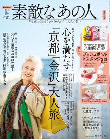 3月16日(水)発売の『素敵なあの人』5月号では、「60代の大人旅」について大特集。付録は、PEANUTS(ピーナッツ)の楽らくプッシュボトル&スポンジ2個セットです。