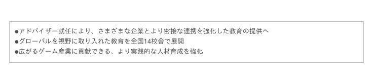 その他、セミナーや企業課題などの機会をいただき現場が求める人材を育てるための『企業連携』、学内コンテストによる全国校舎で競争やオンラインによる特別授業などの『全国展開サポート』、3つの軸を掲げて業界で活躍できる基礎力と実践力の習得を目的とした教育をおこなっております。