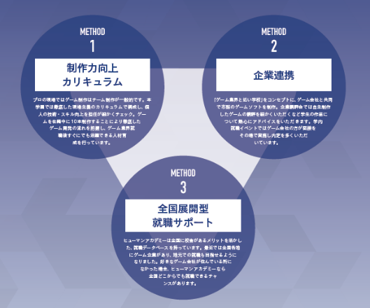 『なりたい自分になる』という総合学園ヒューマンアカデミーの教育理念のもと、多くの制作経験を積みながら実践的に学ばせる『制作力向上カリキュラム』を中心に教育をおこなっています。