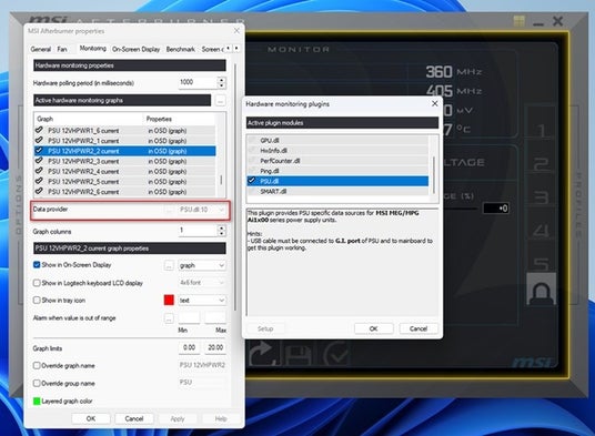 Afterburnerをインストール後、「Settings」を開き、「Monitoring」タブに切り替えます。「Data provider」セクションから「PSU.dll」をロードします。