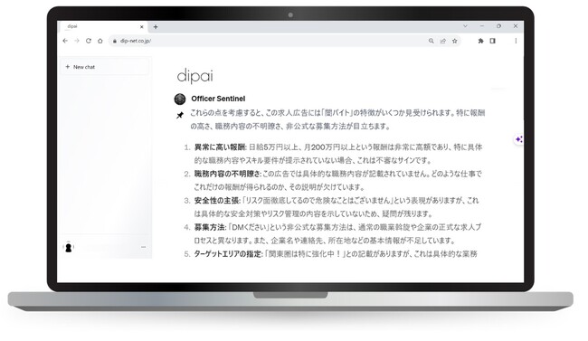 ディップ株式会社(以下「当社」)は、生成AI技術を活用した新たな取り組み「闇バイトチェックAI」(以下、「本施策」)を開始いたしました。同時に闇バイト相談窓口を設置し、ユーザーからの申告情報の確認を進め、さらなる高い精度での闇バイト検知を実施してまいります。