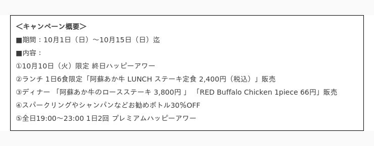 6周年を迎えた今年は、日頃のご愛顧に感謝をこめて、6にちなんだお得なキャンペーンを開催。パブリックレッド人気のドリンクが破格のお値段で楽しめる他、希少な「阿蘇のあか肉」を使ったステーキをランチ、ディナータイムで提供します。また今年から期間中1日2回、特別メニューを特別価格で提供する「プレミアムハッピーアワー」も実施いたします。15日間の周年イベントに是非足をお運びください。