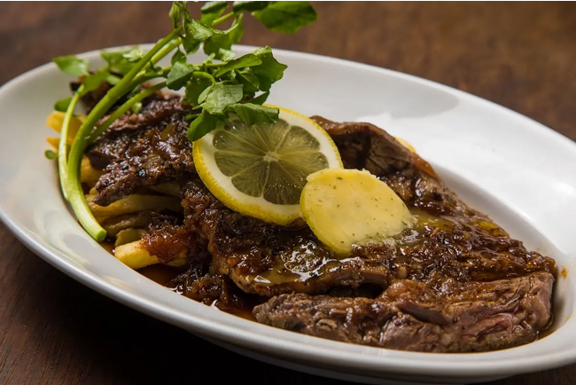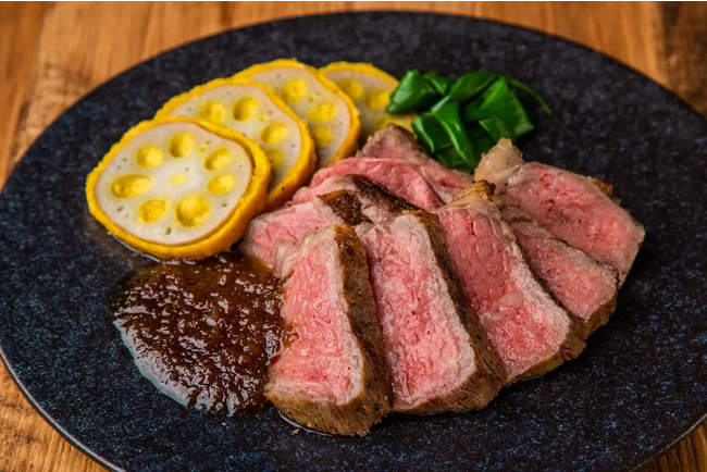熊本・阿蘇の雄大な自然の中で育った希少な和牛“あか牛”は、サーロインに近いロースの部位を使用。阿蘇あか牛と同じ熊本県ならではの調味料「まー油」を使った、にんにくの香ばしさと酸味の効いたオニオンソースをつけてお召上がりいただきます。