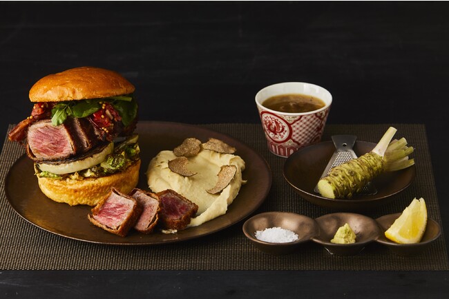 神戸エリア復活を記念して、オープン日の2月11日(土)から2月20日(月)までの期間、「特上 神戸牛カツバーガー -黒トリュフ添え-」を販売します。国産和牛専門店から、このためだけに特別に仕入れたA5ランクの神戸牛リブロース。その中でも、最も美味なる「芯」のみを取り出し、高温でサクッと上げた牛カツは、非常に柔らかくジューシーで、いつまでも舌の上にその甘さと存在感が尾を引く余韻をもち、一度味わうと忘れられない贅沢な一品。最後の仕上げに、高級食材「黒トリュフ」をテーブルでスライスすれば、芳醇な黒トリュフの香りを存分に堪能いただけます。その他、肉を様々に楽しむ別添の赤穂塩・レモン・本わさびをご用意。自身ですり下ろすわさびは、香りがよく、鼻に抜ける爽やかな辛味が特徴。神戸牛ならではの脂の上品な甘さと旨みを最大限に引き出します。豪華な神戸牛カツバーガーは1日3食限定で、公式オンラインショップで事前予約が可能。