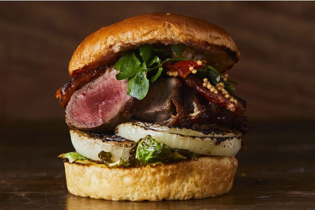 アメリカ産の最高級部位サーロインは、旨みの強い赤身にほど良い脂がのり、噛むほどに肉本来の味わいを感じられる一品。100gの牛カツを肉厚にカットし、旬の芽キャベツとオニオンリングやドライトマトと共にサンド。あふれる肉汁もバンズが受け止め、お肉のおいしさをより一層楽しむことができます。