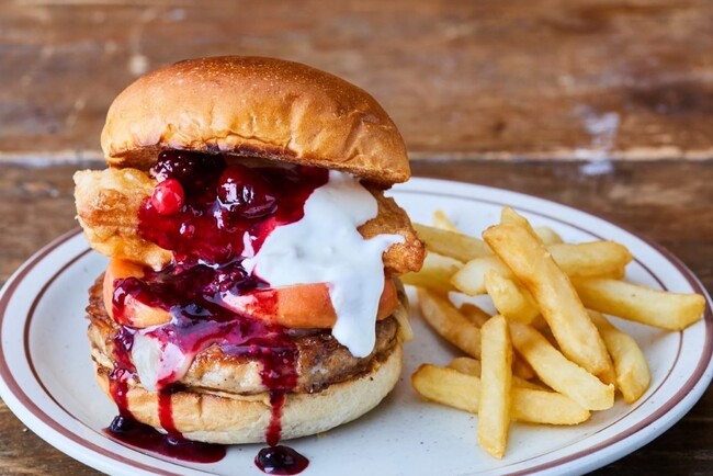 カスタードアップルパイ&粗挽きビーフパティの意外な組み合わせくせになる究極の甘じょっぱ系バーガー。ベリーソースとリンゴヨーグルトソースの酸味が丁度いいアクセント。