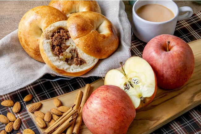 口の中いっぱいに広がるリンゴの果肉感と爽やかさ、ふんわり香るシナモンが秋らしい季節限定ベーグル。甘酸っぱいリンゴのコンフィチュールとシナモン香るアーモンドクリームをあわせて、口溶けのいいベーグル生地で包み込んで焼き上げました。