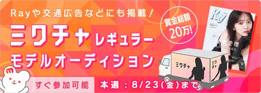 レギュラーモデルに選ばれた方には2024年10月~12月の3ヶ月間、女性ファッション誌『Ray』や関東を走るJR車両内の中吊り広告、都内を走行するアドトラックや「ミクチャ」アプリ内広告のいずれかにモデル掲載されます。(掲載時期は広告媒体により変動あり)