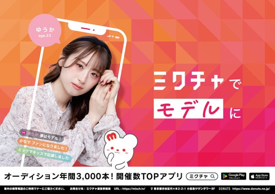 株式会社DONUTS(東京都渋谷区、代表取締役:西村啓成)が開発・運営するライブ配信&動画アプリ「ミクチャ」は、これまで数多くの著名人・タレントを起用してきた「ミクチャ」公式広告モデルをライバーから選出する「ミクチャレギュラーモデルオーディション」を開催中です。現在、2024年10月~12月担当モデルのエントリーを受付中です。【募集期間:2024年8月5日(月)21:00~8月23日(金)23:59】