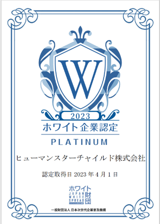 保育事業を展開するヒューマンスターチャイルド株式会社(本社:横浜市、代表取締役:川下 裕左、以下「当社」)はこのほど、ホワイト企業認定制度を展開する一般財団法人日本次世代企業普及機構(本部:大阪市北区、代表理事:岩元 翔、以下「ホワイト財団」)より、4年連続の「ホワイト企業」として認定されました。また、3年連続最上位ランクであるプラチナランクに認定されました。