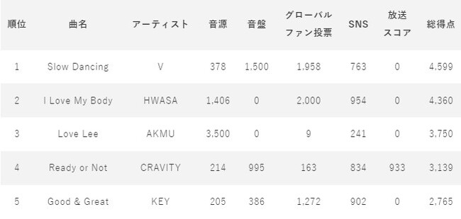 (※)各スコアの割合音源35%、音盤15%、グローバルファン投票(アプリ)20%、SNS10%、
