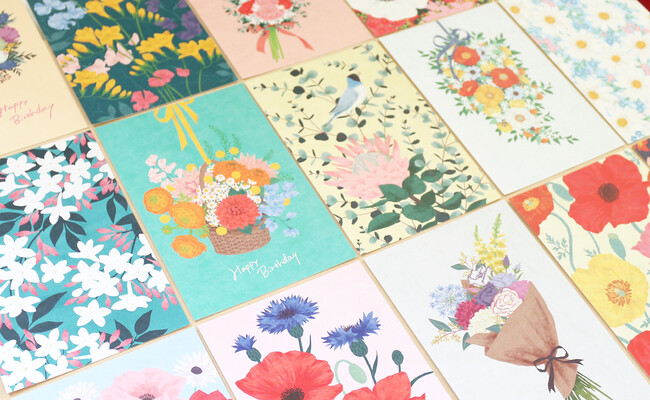 「sotlight」動植物をモチーフにした温かみのあるカード。イラストレーター小池葉月が作画・企画・製造までを手掛けた多彩なカードたち。今回は花柄のカードがフラワーマルシェのようにブースを彩ります。