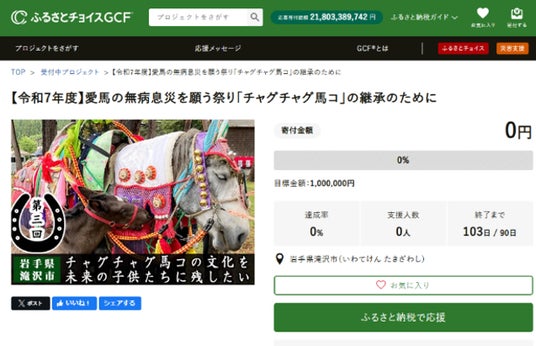 岩手県滝沢市(市長:武田 哲、以下「滝沢市」)と国内最大級のふるさと納税総合サイト「ふるさとチョイス」( https://www.furusato-tax.jp/ )を企画・運営する、株式会社トラストバンク(本社:東京都品川区、代表取締役:川村憲一、以下「トラストバンク」)は、本日4月7日(月)トラストバンクが提供する、ふるさと納税制度を通じてクラウドファンディング型で寄付を募る仕組み「ガバメントクラウドファンディング(R)」(以下「GCF(R)」)で、愛馬の無病息災を願う祭り「チャグチャグ馬コ」の継承を目的としたプロジェクトを開始します。募集期間は2025年4月7日~7月5日(90日間)で、目標寄付金額は100万円です。