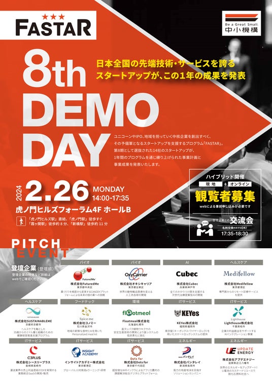 独立行政法人中小企業基盤整備機構(理事長:豊永厚志 本部:東京都港区)は、アクセラレーション事業FASTAR第8期にご参加いただいた企業14社がプログラムを通じて策定した成長戦略・事業計画を発表するピッチイベント「FASTAR 8th Demo Day」を2月26日(月曜)に開催します。