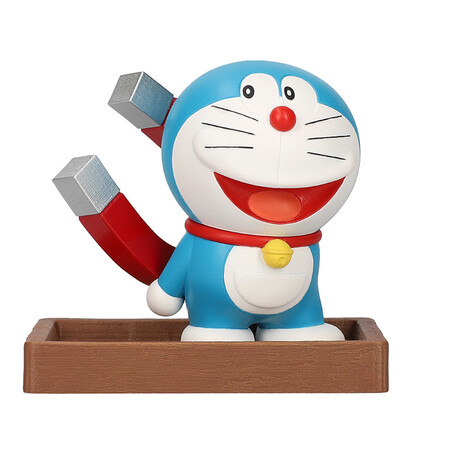 ドラえもんが大きなU字磁石を背負った立体小物トレイは、フィギュアとしてはもちろん、デスク周りの小さな小物を飾りながらすっきりとまとめられる、実用性を兼ね備えたアイテムです。U字磁石の先端には本物の磁石が内蔵されており、金属製のクリップや小物をくっつけてまとめたり、輪ゴムやマスキングテープなどリング状のものを引っかけて収納することができます。また、台座のトレイには小さなスペースがあり、印鑑や指輪、アクセサリーなど、散らかりがちな小物をひとつにまとめておくのにぴったりです。